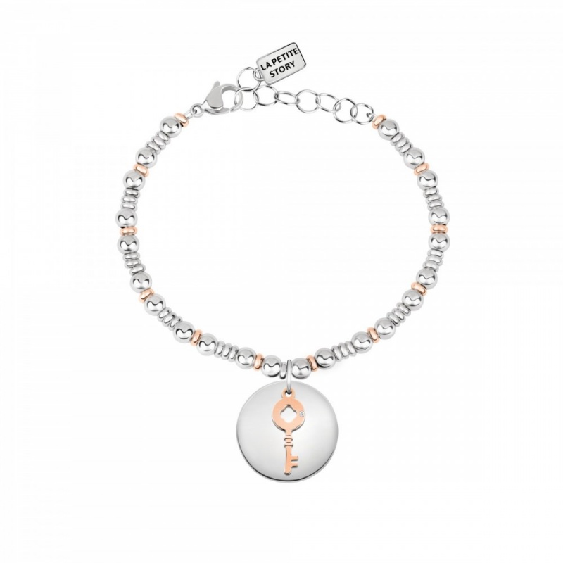 LA PETITE STORY to marka „biżuterii sentymentalnej”. Bransoletki, naszyjniki, kolczyki, charmsy powstały z myślą o młodych, nowoczesnych i kreatywnych kobietach,które chcą w oryginalny sposób wyrażać siebie i to, co jest dla nich ważne. Bransoletka LA PETITE STORY model LPS05APY10 jest wykonana ze stali antyalergicznej i nie zawiera niklu. Kluczyk przy zawieszce ma kolor różowego złota i jest ozdobiony cyrkonią. Rozmiar bransoletki to 17 cm ale dzięki przedłużce można ją zapiąć na dowolny mniejszy rozmiar. Bransoletka jest zapakowana w oryginalne eleganckie opakowanie, które nadaje się na prezent.